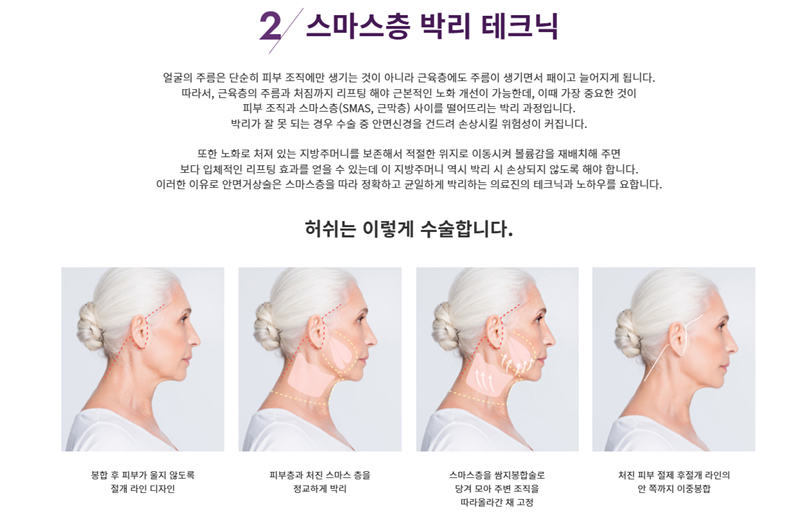 안면거상술이란? 늘어진 피부만 단순히 당기는 것이 아니라, 피부 아래 근막층(SMAS층)까지 당겨 올려 얼굴 전반의 탄력과 윤곽을 개선하는