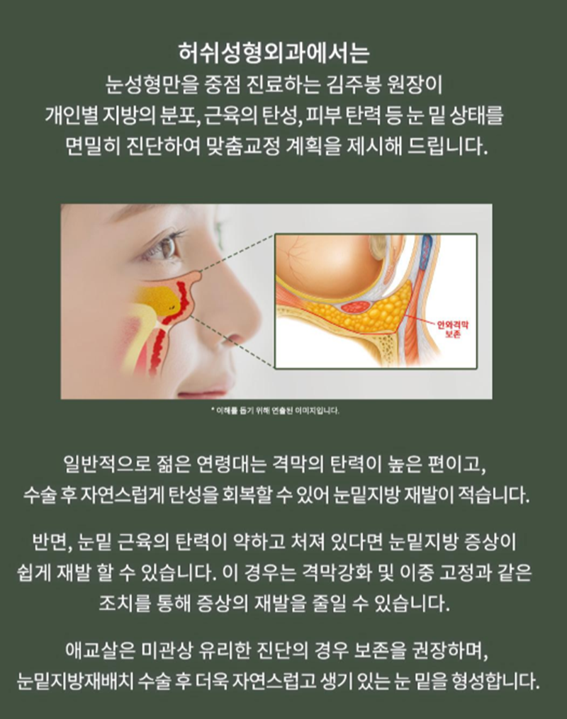 개인의 눈가 상태에 따라 수술 방법이 달라질 수 있으므로, 전문 의료진과의 충분한 상담이 필요합니다.