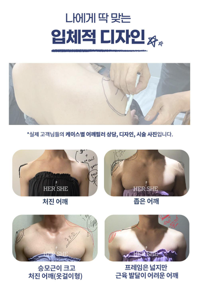 : 어깨라인 확실한 변화, 넓은 어깨 느낌 강조, 체형 변화 효과 큼 등 어깨가 많이 좁거나 확실한 변화를 원하는 경우 고려될 수 있습니다.