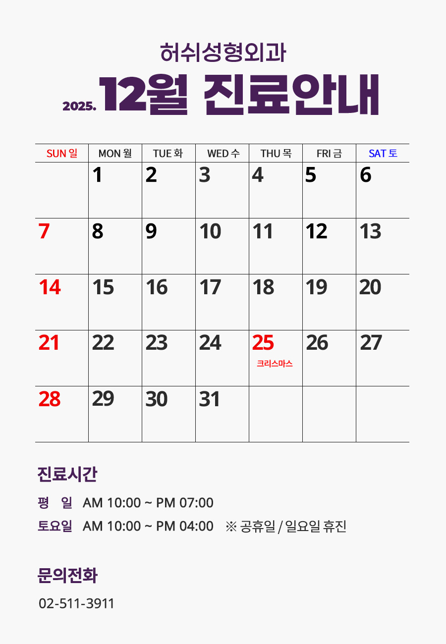 [허쉬성형외과] 2025년 12월 진료일 안내 2025-11-25 hit.369 |